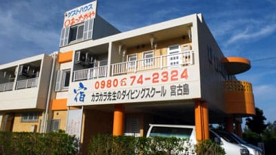 宮古島のカラカラ先生のショップは、市街地から車で約5分、荷川取漁港から2分という場所に位置しています。1階がダイビングショップ、2階が宿泊施設「あったかや」となっています。 観光名所の「砂山ビーチ」へは車で約5分、自転車で約10分の距離です。無料レンタサイクルが4台ありますので、あったかやを起点にして観光することにも適しています。 コンビニへは自転車で約3分。 西側は、伊良部島と伊良部大橋を望むことができます。 器材洗い場・干場もございます。 海から帰ったらみんなでログ付タイムです。 駐車場も約10台分ございます。レンタカーで集合ご希望の方はお気軽にお申し出ください。