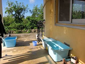 ダイビング器材は、こちらで洗っていただけます。器材専用の他カメラ・レギュレーター専用の桶もご用意しています。 翌日も引き続きダイビングをされる方は、お帰りになる際にメッシュバッグに器材をつめて下さい。ウエットスーツは、ハンガーにかけたままで結構です。翌朝、スタッフがボートへお持ちいたします。 また、レンタル器材の方はスタッフが洗浄しますのでそのまま店内へお入りください。 また、最終日にショップから器材を郵送ご希望の方は、器材が乾きましたらスタッフがパッキングしてお送りいたしますので、干した場所と品目の確認をスタッフと一緒にお願いいたします。着払いは、ヤマト運輸・ゆうパック、元払いはゆうパックがご利用いただけます。