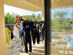 器材干場です。洗った器材はこちらで干して下さい。ハンガーはご自由にお使い下さい。また、似たような器材がたくさんありますので、ご自身の器材はなるべく1箇所にまとめて干していただきますようお願いいたします。温水シャワーも2機あります。