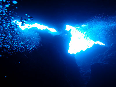 2本目はツインケーブへ。地形探検ダイビング♪ ケーブ内にはウコンハネガイやアオギハゼやツバメタナバタウオ、