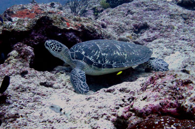 根の上ではアオウミガメ、根の下ではタイマイがお休み中でした。