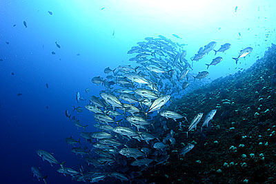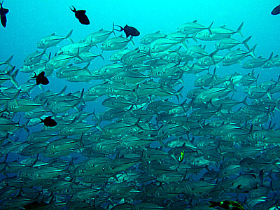 1匹1匹では迫力を感じませんが、群れになると他の魚も避けていきます。ノコギリダイはちゃっかり混ざっていますが(笑)