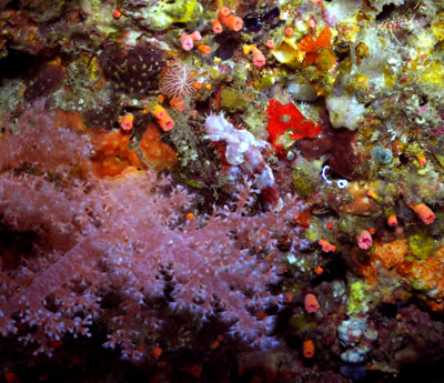サンゴの隙間には大きくて白いオオモンカエルアンコウがいたり