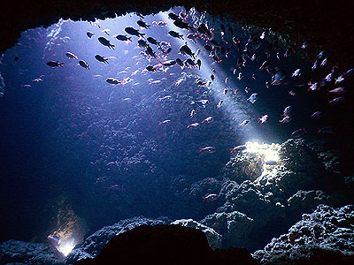 光が差し込んでいて、真下から見上げるとアカマツカサやミナミハタンポの魚のシルエットと