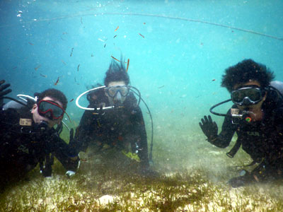 潜るときはいつも3人一緒!仲良し女子3人!!手作りのフラッグでお祝いです!