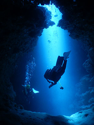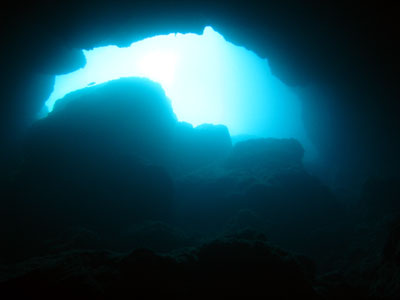 1本目のサンゴホールはダイナミックな地形のポイントです。真っ暗なホールの入り口を入ると出口のブルーが