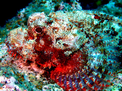 アカネハナゴイやハナゴイが群れる棚では大きなオニカサゴが岩の隙間に潜んでいました。