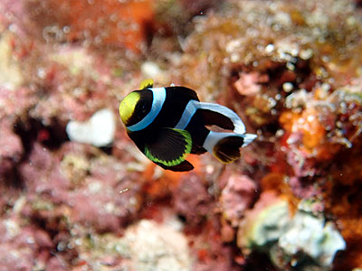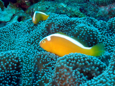 黒縁カクレクマノミ、ユビエダハマサンゴに群れるデバスズメダイ、THE南国!という雰囲気の水中が癒されます。