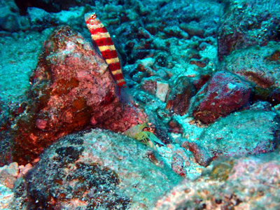 ヒメダテハゼがテッポウエビと共生していました。このハゼは目の上に3本のラインがあり