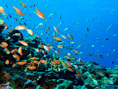 アカネハナゴイの群れやノコギリダイの群れ、ゴマウツボやタテジマキンチャクダイ、