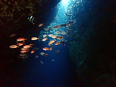 洞窟好きなスミレヤッコやミナミハタンポの群れ、アカマツカサの群れ、