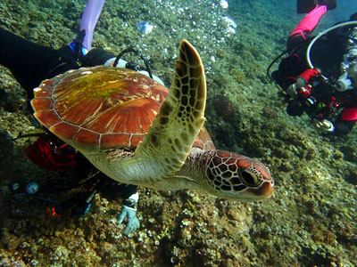 裏の色が綺麗なセンジュイソギンチャクとハナビラクマノミ、窪みにはまって、お昼寝中のアオウミガメ。