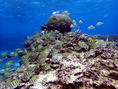 デバスズメダイやミスジリュウキュウスズメダイが群れるサンゴを眺めると
