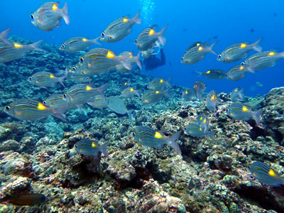 洞窟へ向かう道中は、ウメイロモドキ・クマザサハナムロの群れを見ているとその下には