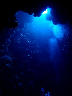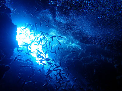 洞窟の中から入り口をみるとものすごくキレイ!洞窟のなかには、シモフリタナバタウオ・ベニマツカサ・オヨギベニハゼが