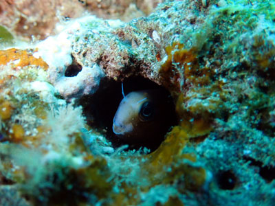 ゴロタの所には、岩の窪みからヒトスジギンポ・クロスジギンポ・フタイロカエルウオなどが顔だけ出している姿が