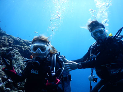 仲良しのお二人が初めての体験ダイビングにチャレンジです。最初は呼吸に慣れなかったり、
