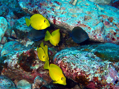 岩影にはヒレナガスズメダイ幼魚や派手柄のシチセンベラが見られました!